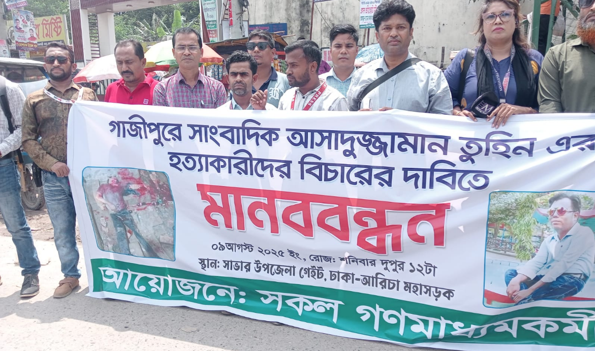 গাজীপুরের সাংবাদিক আসাদুজ্জামান তুহিনকে নৃশংসভাবে হত্যার প্রতিবাদে সাভারের সাংবাদিক সমাজও রাজপথে নেমেছে। দেশব্যাপী চলমান প্রতিবাদের অংশ হিসেবে আজ, শনিবার, ৯ই আগস্ট বিকেলে সাভার উপজেলা পরিষদের গেট সংলগ্ন সামনে এক মানববন্ধন ও প্রতিবাদ সমাবেশ অনুষ্ঠিত হয়।