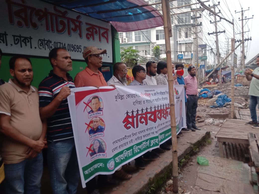 কুমিল্লা কোতোয়ালী মডেল থানার ভারপ্রাপ্ত কর্মকর্তা ওসি মহিনুল ইসলাম এবং জেলার পুলিশ সুপার নাজির আহমেদের বিরুদ্ধে ঢাকার আশুলিয়া থানা এলাকায় আশুলিয়া রিপোর্টার্স ক্লাবের সামনে মানববন্ধন অনুষ্ঠিত হয়।