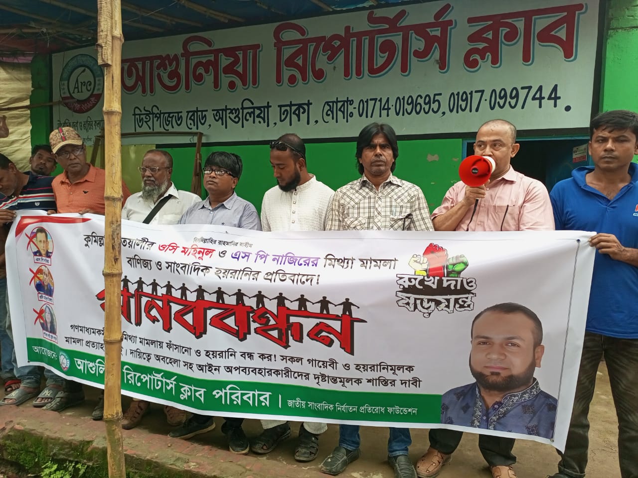 কুমিল্লায় কোতয়ালি থানার ওসি মহিদুল ও এসপি নাজির হোসেনের মিথ্যা মামলা বাণিজ্য ও সাংবাদিক হয়রানির প্রতিবাদে মানববন্ধনে অংশগ্রহণ করেন, আশুলিয়া রিপোর্টার্স ক্লাবের সভাপতি কামাল হোসেন, সহসভাপতি মাসুদ রানা, সাধারণ সম্পাদক আল শাহরিয়ার বাবুল খান, যুগ্ম সাধারণ সম্পাদক শফিকুল ইসলাম, অর্থ সম্পাদক রিপন মিয়া , সিনিয়ার সাংবাদিক নুর হোসেন, আশা চৌধুরী, সোহেল রানা, সাবেক সেনা কর্মকর্তা আঃ আলিমসহ ক্লাবের সকল সাংবাদিকবৃন্দ।