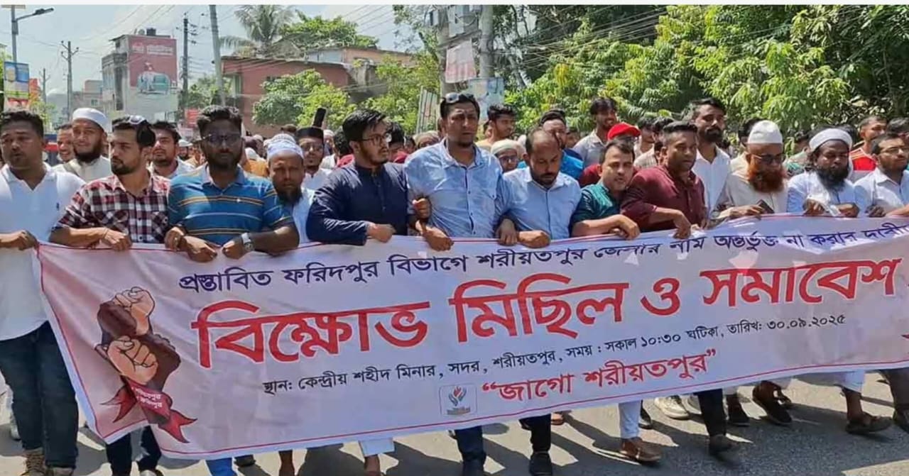 ঢাকা বিভাগের অন্তর্ভুক্ত থাকার দাবিতে শরীয়তপুরে সড়ক অবরোধ ও বিক্ষোভ কর্মসূচি পালন করেছে ‘জাগো শরীয়তপুর’।