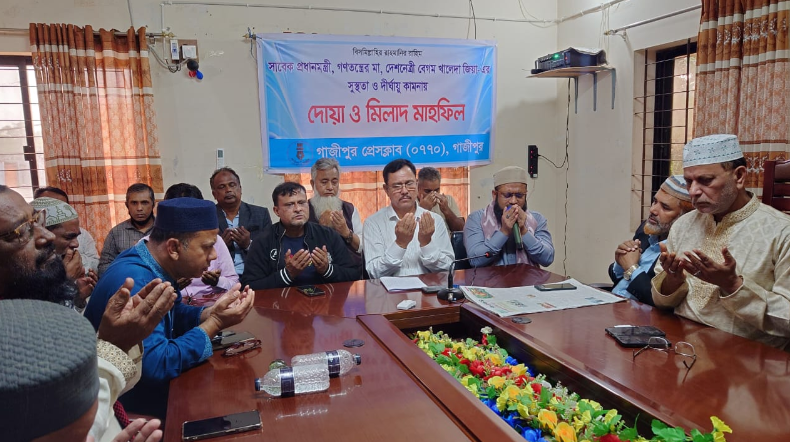 সাবেক প্রধানমন্ত্রী ও বিএনপির চেয়ারপারসন দেশনেত্রী বেগম খালেদা জিয়ার দ্রুত রোগমুক্তি, সুস্থতা ও দীর্ঘায়ু কামনায় গাজীপুর প্রেসক্লাবের উদ্যোগে বিশেষ দোয়া ও মিলাদ মাহফিল অনুষ্ঠিত হয়েছে।