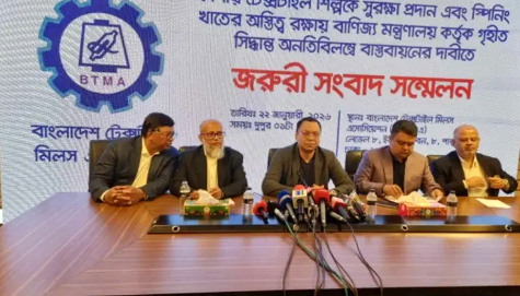 আগামী ১ ফেব্রুয়ারি থেকে অনির্দিষ্টকালের জন্য সব টেক্সটাইল মিল বন্ধ রাখার ঘোষণা দিয়েছে বাংলাদেশ টেক্সটাইল মিলস অ্যাসোসিয়েশন (বিটিএমএ)। দেশের সুতা উৎপাদনকারী মিলগুলোকে রক্ষায় সরকারের ‘কার্যকর পদক্ষেপ না থাকা’র অভিযোগ তুলে এই সিদ্ধান্ত নিয়েছে সংগঠনটি।